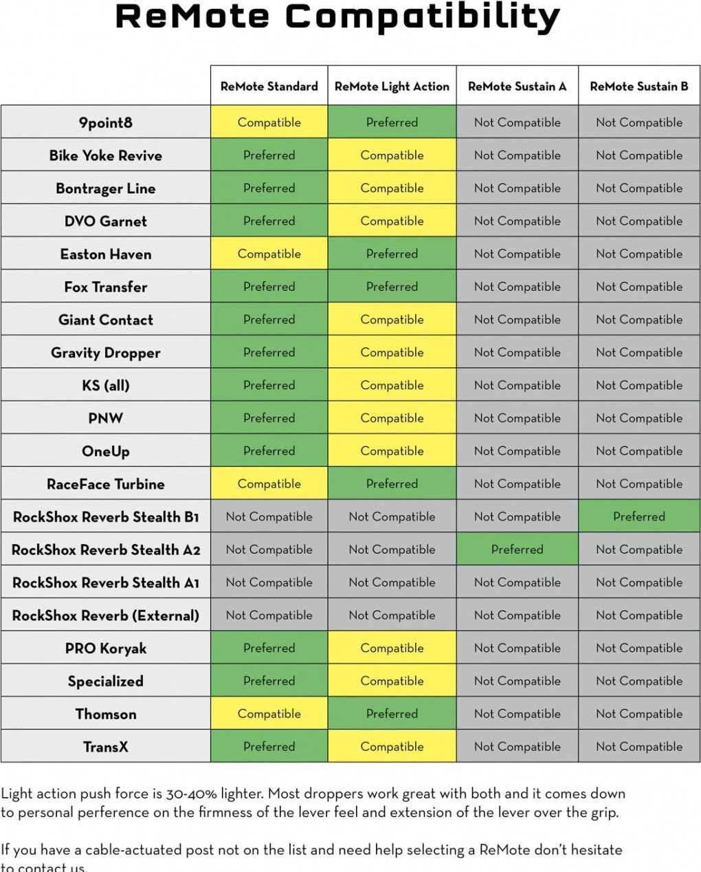 - Broad compatibility: The ReMote LA has been tested and is recommended for use with Thomson, Fox Transfer, Race Face, Easton, and 9point8 cable-actuated dropper posts.